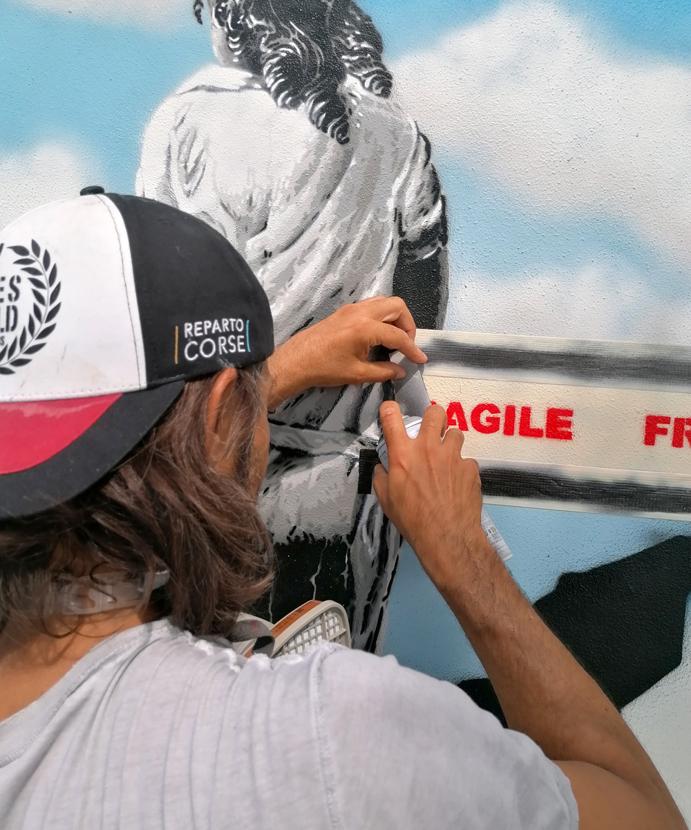 Clubino Art – Il ristorante Clubino quest’anno viene completamente rinnovato nella terrazza all’aperto, uno spazio ricercato, in cui design e arte si mixano per creare uno spazio unico in cui abbandonarsi ai piaceri del cibo e del vino. Qui si inserisce “FRAGILE”, l’intervento di Alessio-b:  “Tutti ti valutano per quel che appari. Pochi comprendono quel che tu sei…” (N.Machiavelli) – Oltre il nastro (fragile) c’è il buco nel muro che rappresenta ciò che sei. Poche persone conoscono veramente come sei…