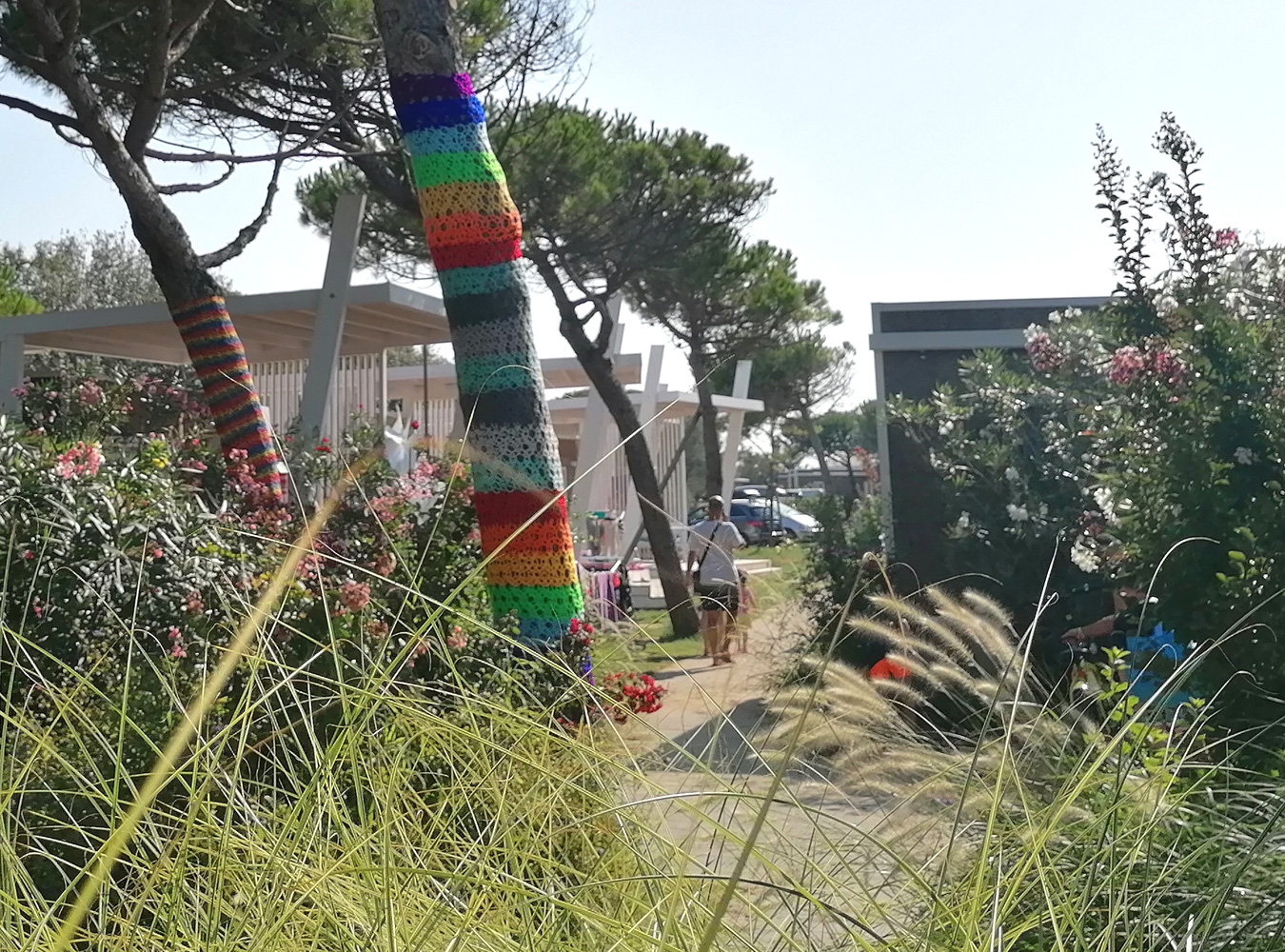 “e quindi uscimmo a riveder le stelle” è un progetto di yarn bombing che declina, negli spazi dell’accoglienza open air, l’arte del croket come mezzo creativo per riappropriarsi degli spazi comuni e avvolgere con il colore e la bellezza gli spazi urbani. In questo caso è usato per veicolare e rafforzare il legame con la natura preesistente, creando, attraverso l’arte, un legame empatico, diretto ed emotivo. I primi “bombardamenti” all’uncinetto, opera di Fabiola Floris, avvolgono i tronchi dei pini marittimi, lungo il viale di accesso al mare.