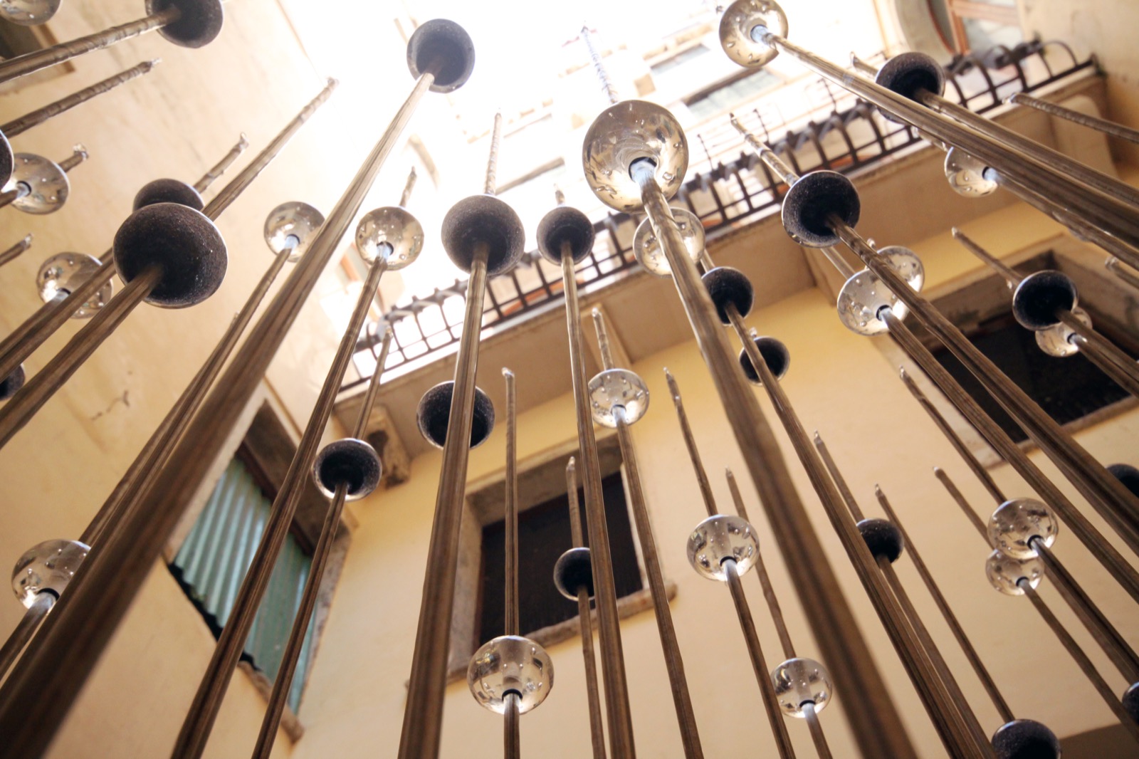 Disegnata da Simona M. Favrin per Forme d’Acqua, è composta da una struttura in acciaio inox e caratterizzata da una serie di canne cave sottilissime, dalla cui sommità esce un riccio d’acqua che, silenziosa e calma, scivola lungo le canne stesse, avvolgendo nel suo percorso le perle di vetro di Murano, realizzate a mano con la tecnica della lavorazione a lume, dalla jewelry designer Barbara Proverbio.
