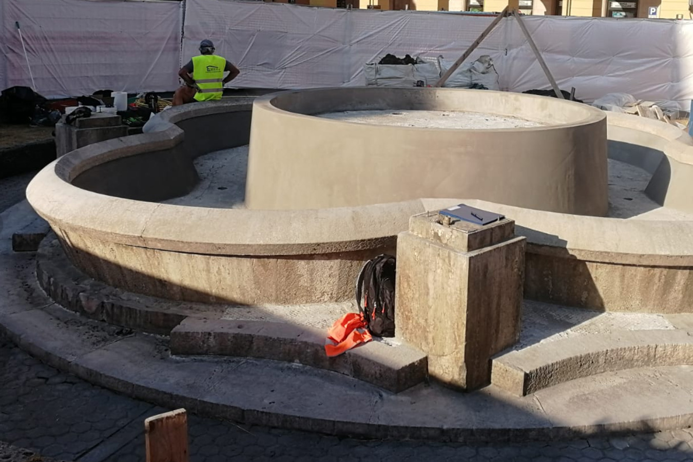 La vasca della fontana era interamente ricoperta da una patina di calcare: insieme alla progettazione MEP e all’aggiornamento tecnologico e struttura dell’impiantistica, sono state eseguite opere edili di ripristino coordinate per Forme d’Acqua dall’arch. Simona M. Favrin che ha curato la scelta dei colori che hanno riportato a nuova bellezza la storica struttura. La pulizia e il ripristino dei marmi sono stati accompagnati dall’impermeabilizzazione della vasca con malta cementizia con aggiunta di pigmentazione studiata per inserirsi in modo armonioso ed integrato nello storico contesto urbano.