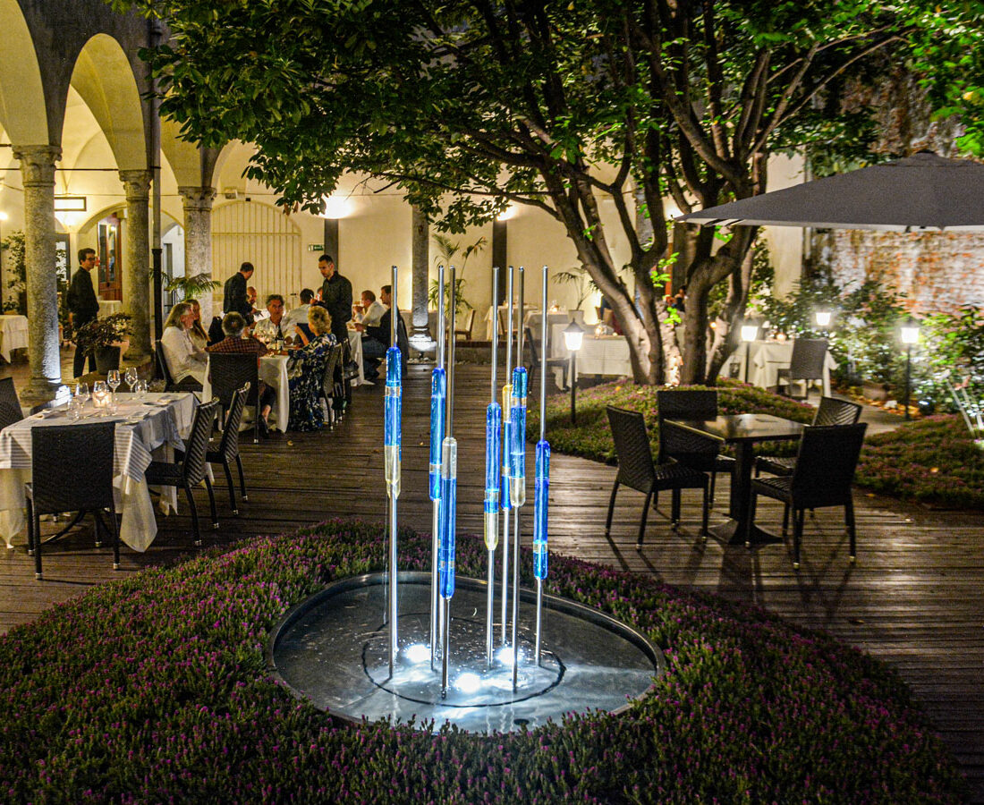 Al centro dell’installazione, la fontana artistica Rhythmus H20 che per l’occasione si veste di nuovi colori, una palette acqua mare, oro e ambra, una metamorfosi che richiama l’unione degli elementi terra e acqua. Già protagonista della Venice Glass Week nel 2019 anche nel restyling per il Fuori Salone mantiene la sua vocazione sostenibile, ispirata alle maree e dall’influenza degli elementi naturali sugli esseri umani. Le decorazioni vitree sono state realizzate dal maestro vetraio muranese Nicola Moretti, una collaborazione di lungo termine con FavrinDesign e Forme d’Acqua Venice Fountains.